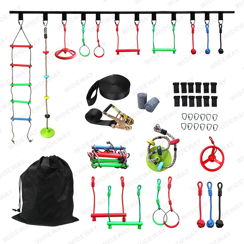 • 끝없는 야외 재미를위한 래칫이있는 15m 슬랙 라인을 가진 어린이를위한 프리미엄 닌자 전사 장애물 코스.